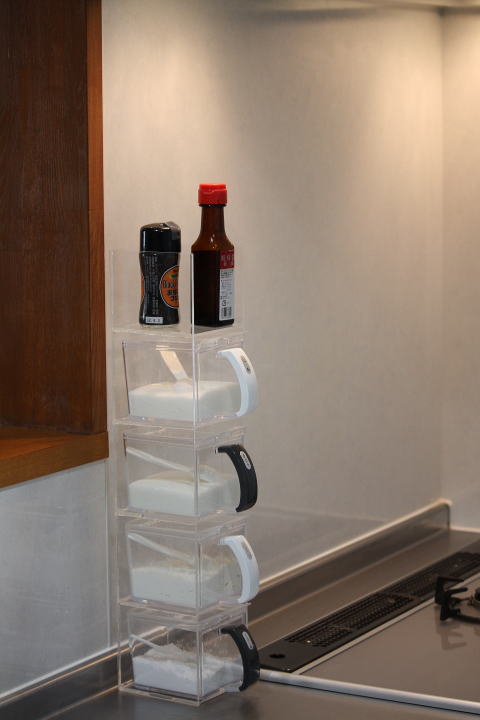 この写真の物は、市販されている調味料入れを4段縦に並べて、最上段にビン入りの調味料を乗せる為にデザインした物です。